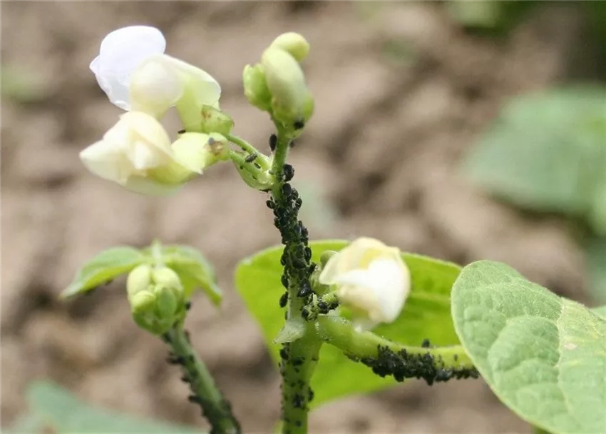 Vor allem an den Ranken, Stängeln und Blütenständen der Busch- und Stangenbohne, bei stärkerem Befall auch auf den Blattunterseiten, sitzen dicht an dicht schwarze Blattläuse.