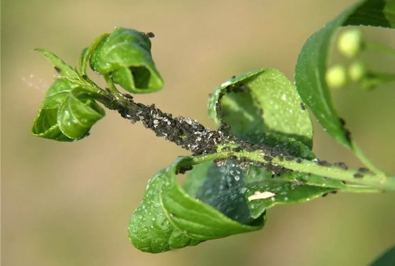 Im Frühjahr sitzen schwarze Blattläuse in großer Zahl an jungen Trieben und Blättern. Durch die Saugtätigkeit können Blätter und Triebe verkrüppeln. Die zuckerhaltigen Ausscheidungen der Tiere verkleben die Blätter. Auf diesem Honigtau siedeln sich sehr bald schwarze Rußtaupilze an.