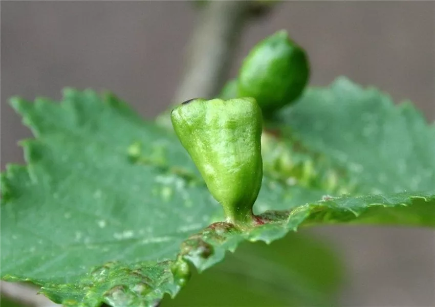 Junge Ulmenblätter zeigen auffällige Deformationen an Blättern. Je nach Blattlausart findet man blasige oder rollenförmige Gallen, in denen sich die grauen Blattläuse befinden.
