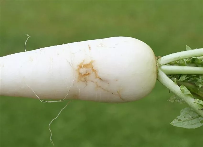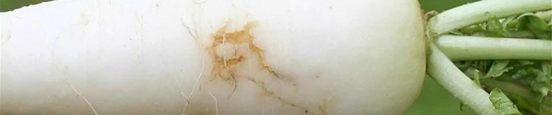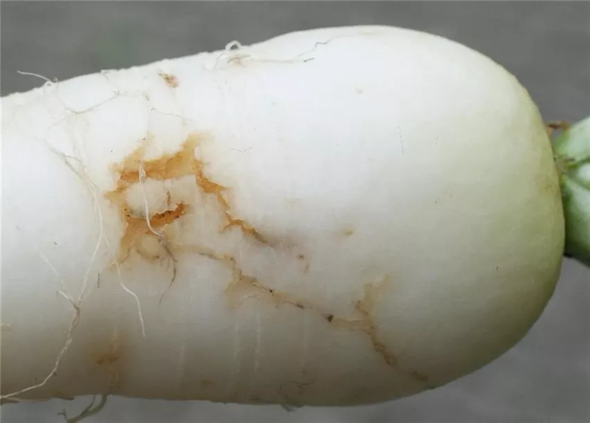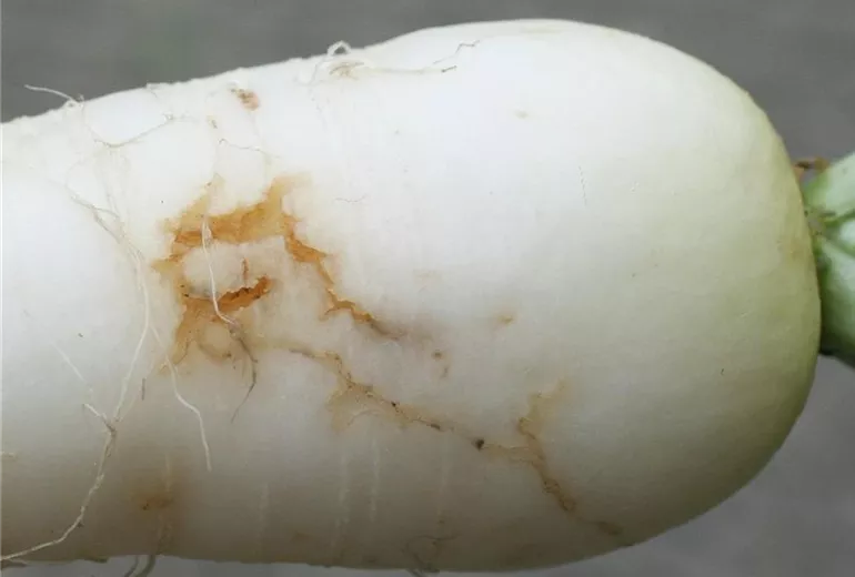 Im Rübenkörper von Radies und Rettich befinden sich Fraßgänge, in denen oftmals auch die cremefarbenen Larven der Kohl oder Rettichfliege zu finden sind.