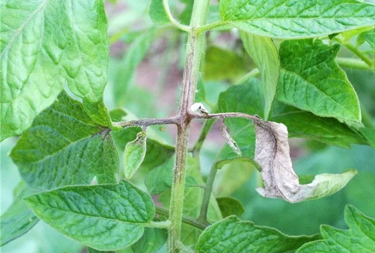 Im Sommer zeigen Tomaten während oder nach feuchten Witterungsperioden auf den Blättern anfangs grau grüne, später braune Flecken; einzelne Fiederblättchen sterben ganz ab. Auch an den Blattstielen und am Stängel findet man meist scharf abgegrenzte dunkelbraune Stellen.