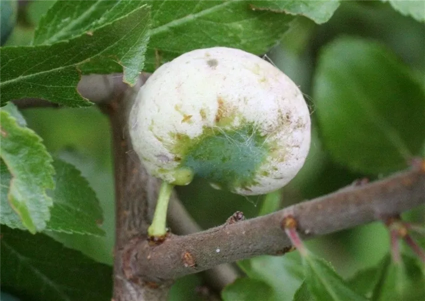 Ein Teil der befallenen Früchte trocknet ein und bildet Fruchtmumien, die den Winter über am Baum hängen bleiben.
