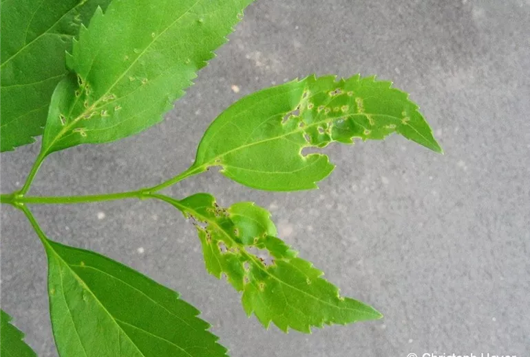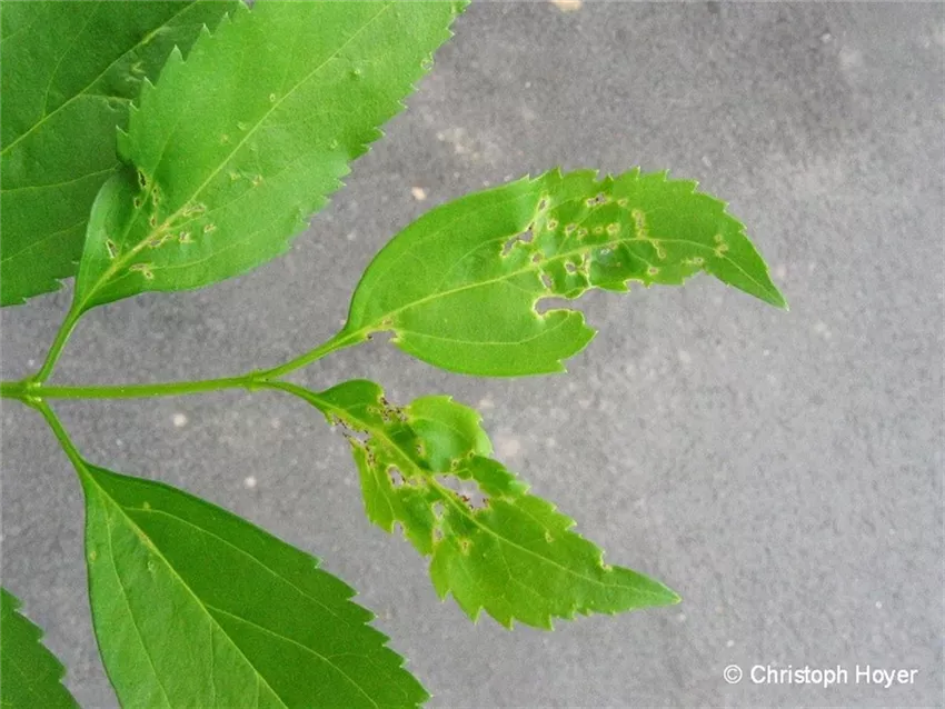Vor allem jüngere Blätter sind deformiert. Sie erscheinen zerstochen oder löchrig. Bei starkem Befall können auch junge noch weiche Triebspitzen geschädigt sein.