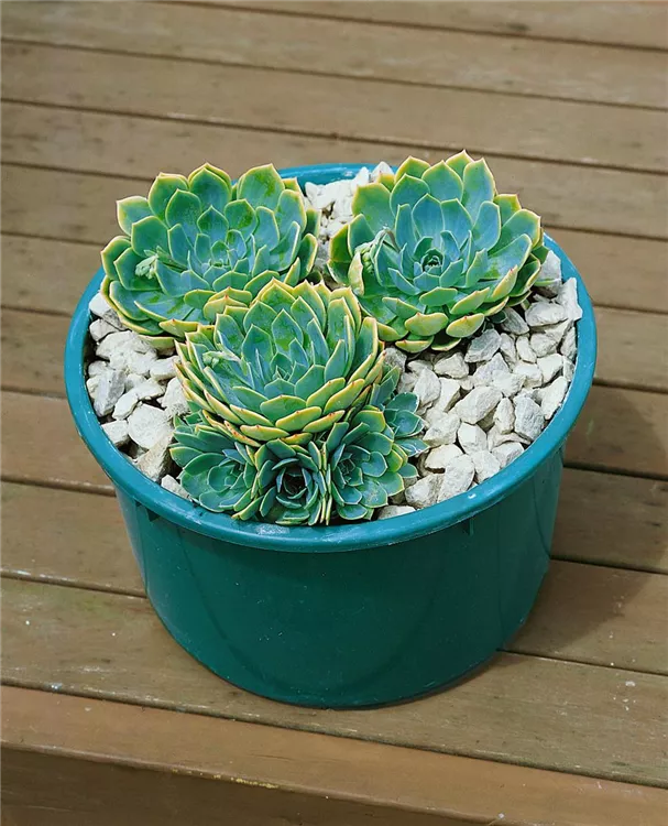 Die Echeverie (Echeveria) ist eine Pflanze mit mittelgrünen, grau-grünen, dickfleischigen Blättern. Die glockenförmigen Blüten erscheinen von Februar bis März. Diese rosettenartige Pflanze gedeiht am besten an einem sonnigen Standort.
