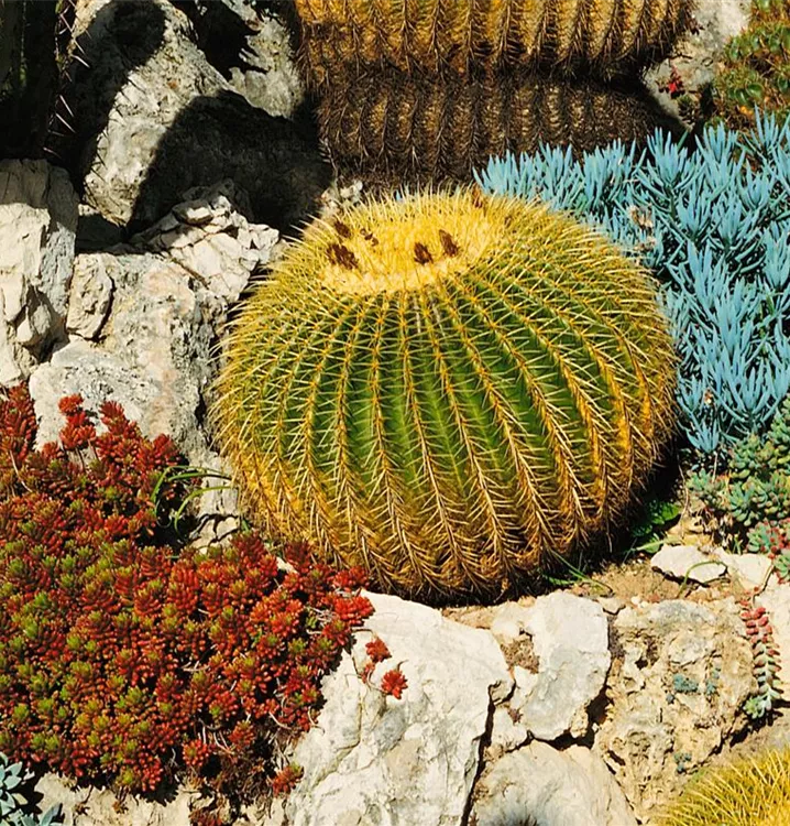 Der Schwiegermuttersessel (Echinocactus grusonii) ist eine Pflanze mit gelben Blüten. Seine trichterförmigen Blüten erscheinen von Juni bis August.Diese kugelförmige Pflanze bevorzugt einen sonnigen Standort und eine durchlässige Pflanzenerde.