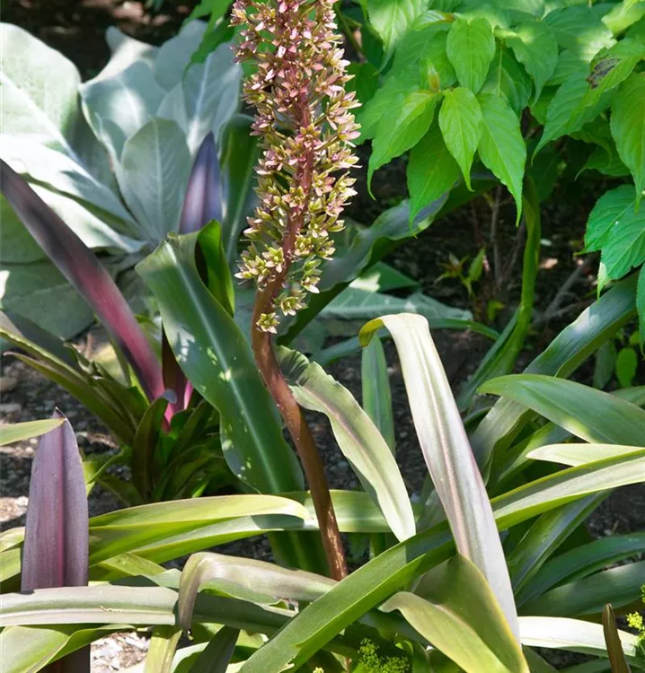 Die Schopflilie (Eucomis comosa) bringt ansehnliche, grün-weiße, leicht duftende Blüten von Juli bis September hervor. Bevorzugt wird ein durchlässiger, humoser Boden in sonniger Lage. Die aufrechte Staude erreicht gewöhnlich eine Höhe von 0,6 - 1 m und wird bis zu 50 cm breit.