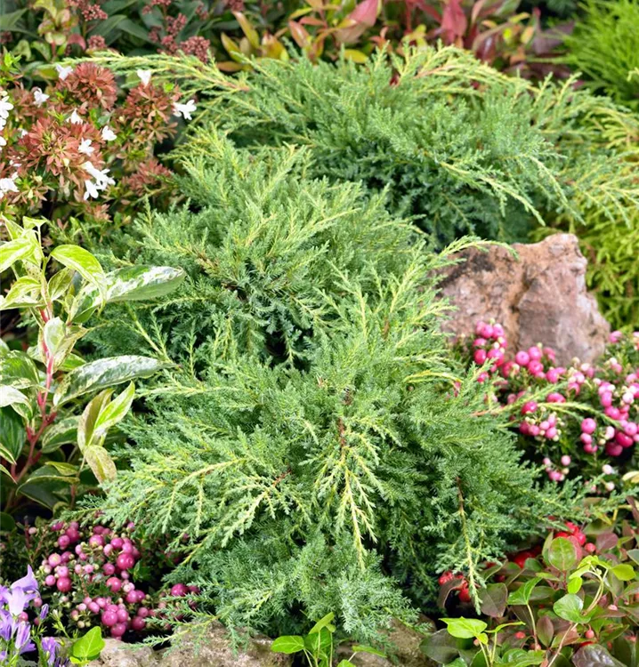 Chinesischer Wacholder 'Golden Saucer' ist ein ausladend wachsender, malerischer Strauch. Er erreicht gewöhnlich eine Höhe von 3 - 4 m und wird ca. 4 - 6 m breit. Rasch wachsend.