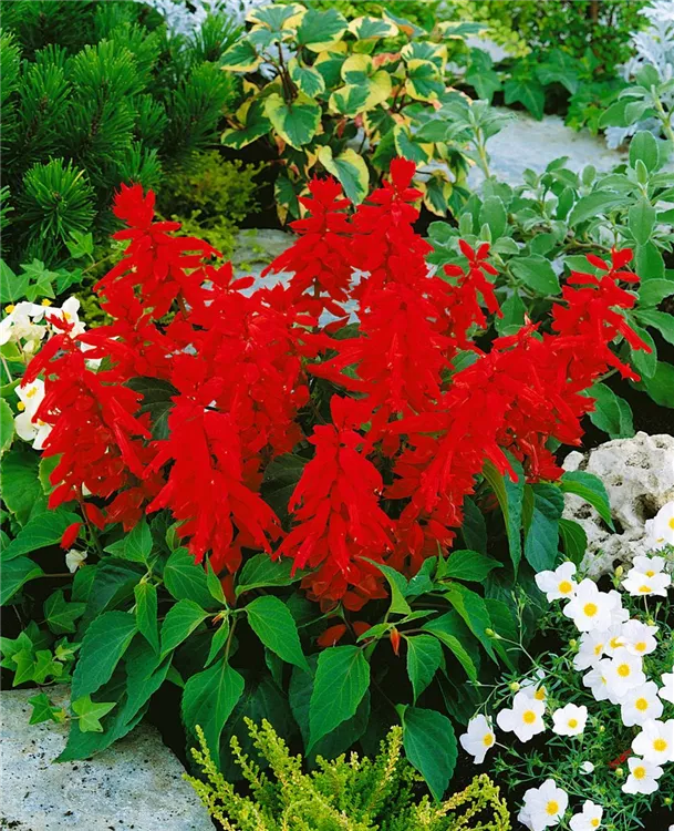 Der Feuersalbei (Salvia splendens) ist eine beliebte Pflanze für den Balkon. Die unzähligen Blüten erscheinen, je nach Sorte, in verschiedenen Farben die ganze Saison hindurch. Ein sonniger Standort und ein durchlässiges Substrat werden bevorzugt.
