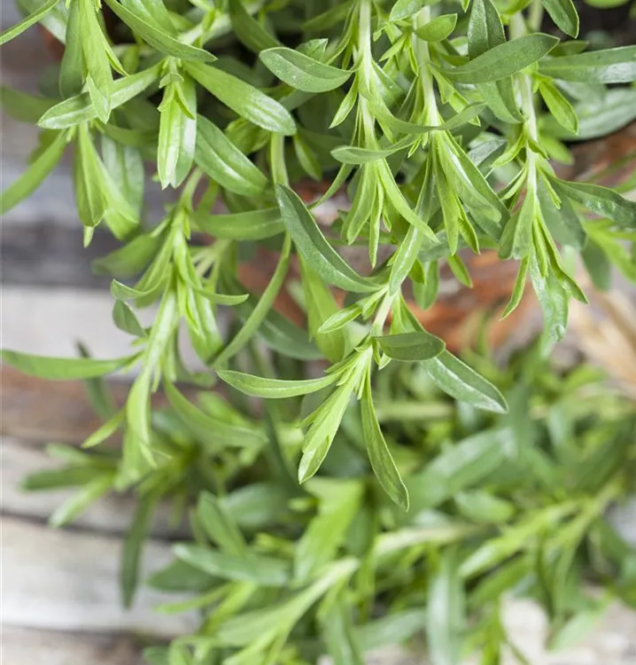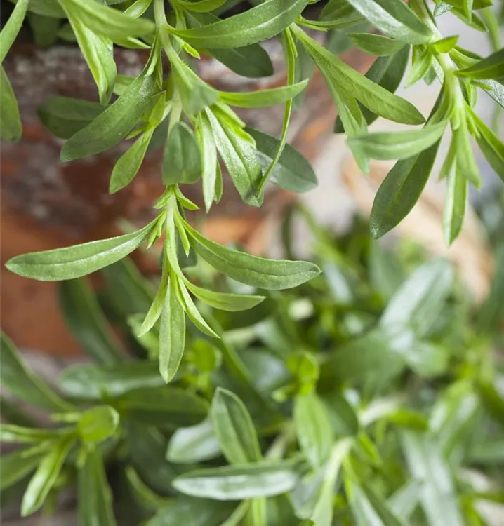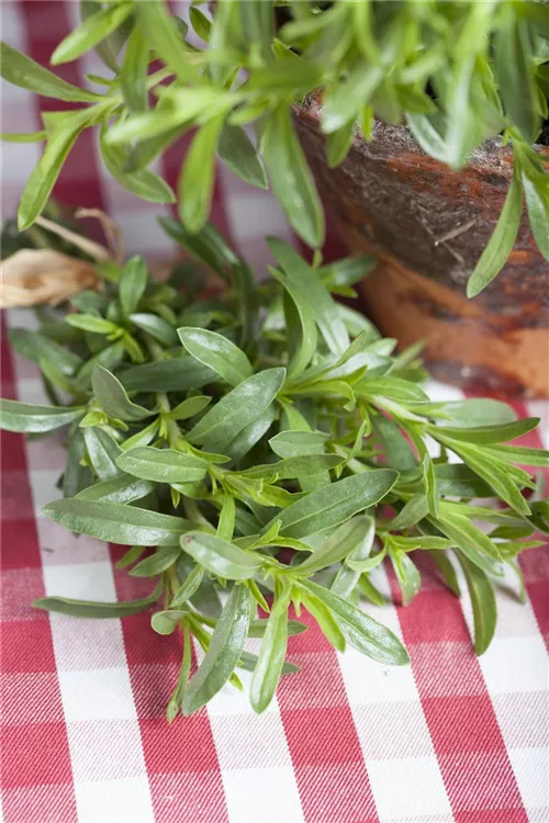 Zum Verzehr geeignet. Die dunkelgrünen Blätter sind lanzettlich und überzeugen mit würzigem Geschmack.