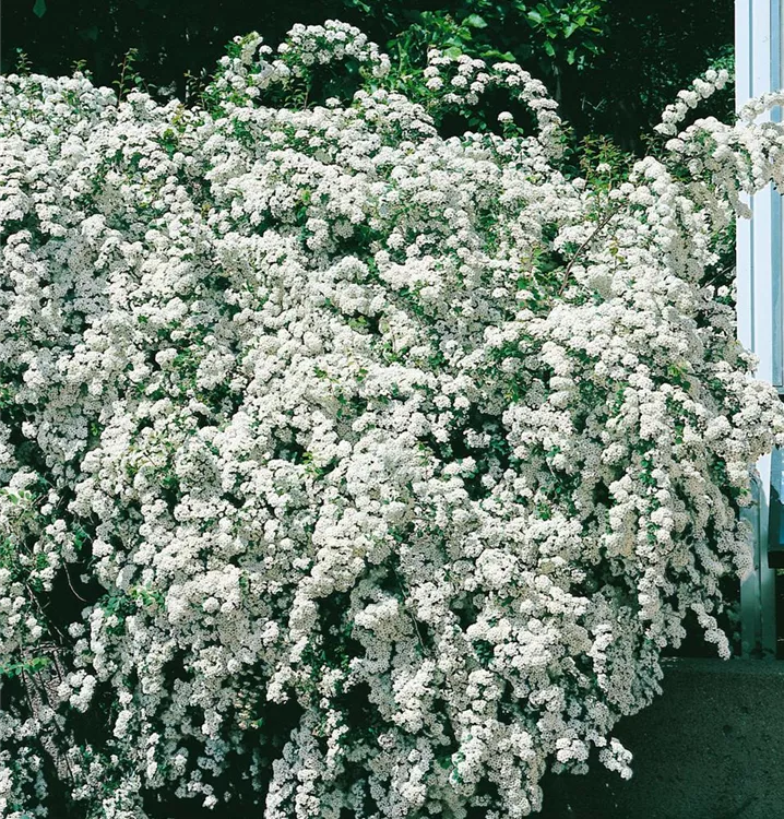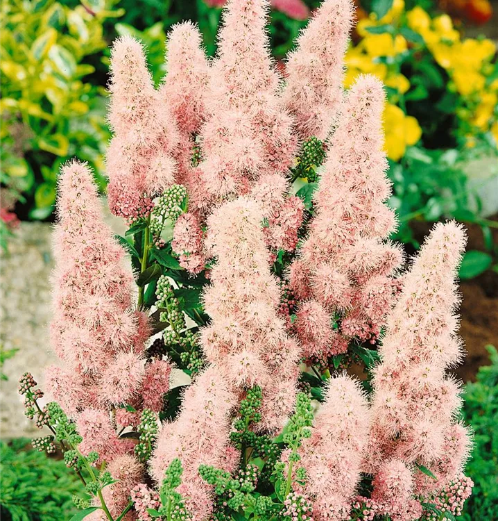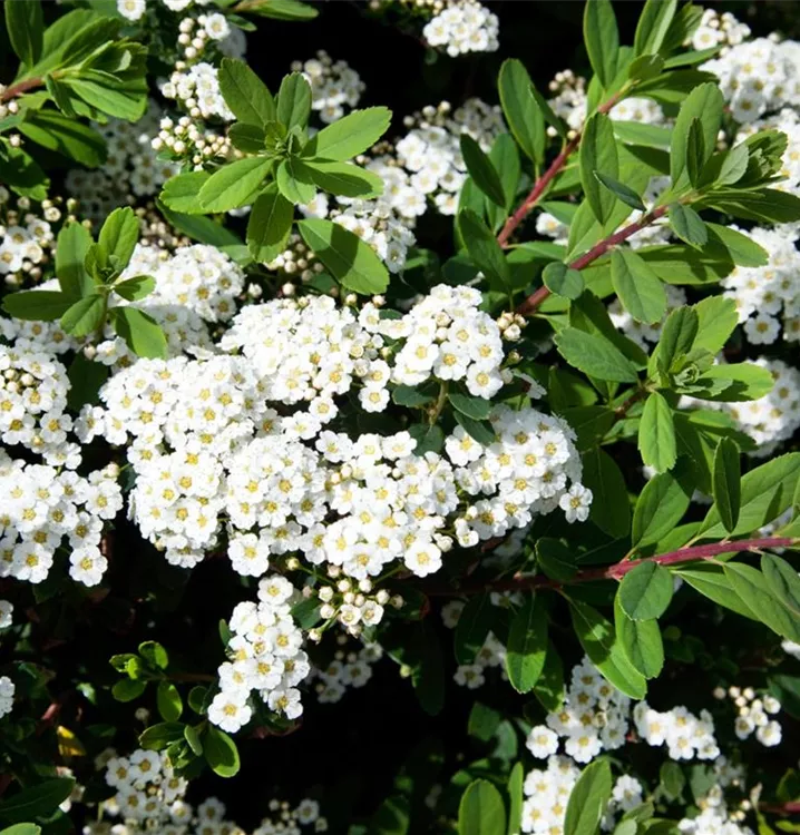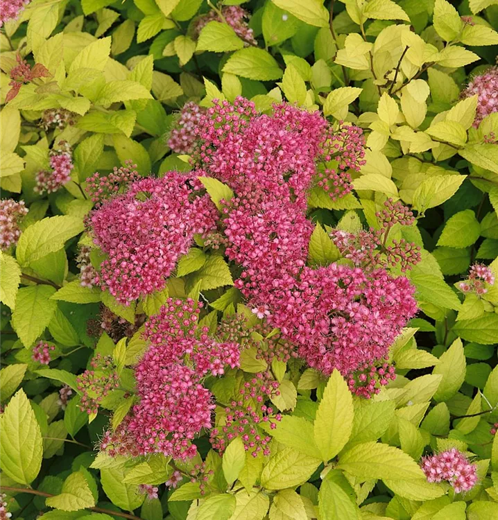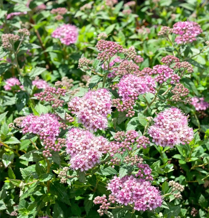 Der Spierstrauch (Spiraea) eine Gartenpflanze, die, je nach Sorte, Blüten in verschiedenen Farben hervorbringt.
