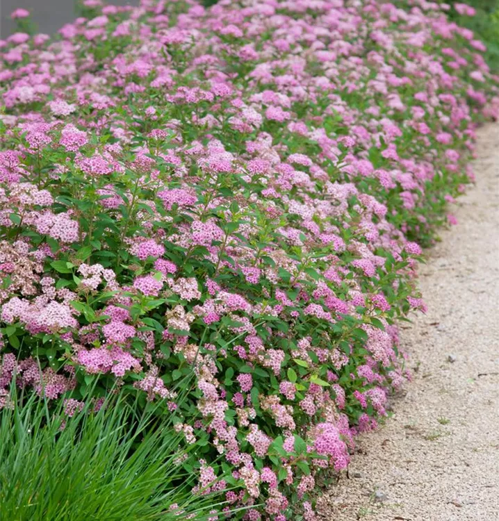 Die Sommerspiere (Spiraea japonica) ein kompakter Kleinstrauch, der, je nach Sorte, Blüten in verschiedenen Farben hervorbringt. An einem sonnigen bis halbschattigen Standort mit durchlässigem, nährstoffreichem Boden erreicht sie gewöhnlich eine Höhe von ca. 60 cm und wird ca. 1 m breit.