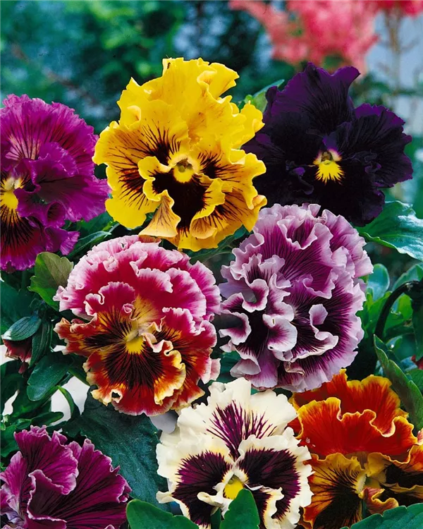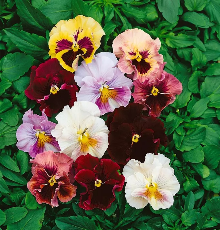Viola x wittrockiana 'Frizzle Sizzle' bildet während der gesamten Saison zahlreiche violette, blaue, weiße, gelbe, orangefarbene, rote Blüten.