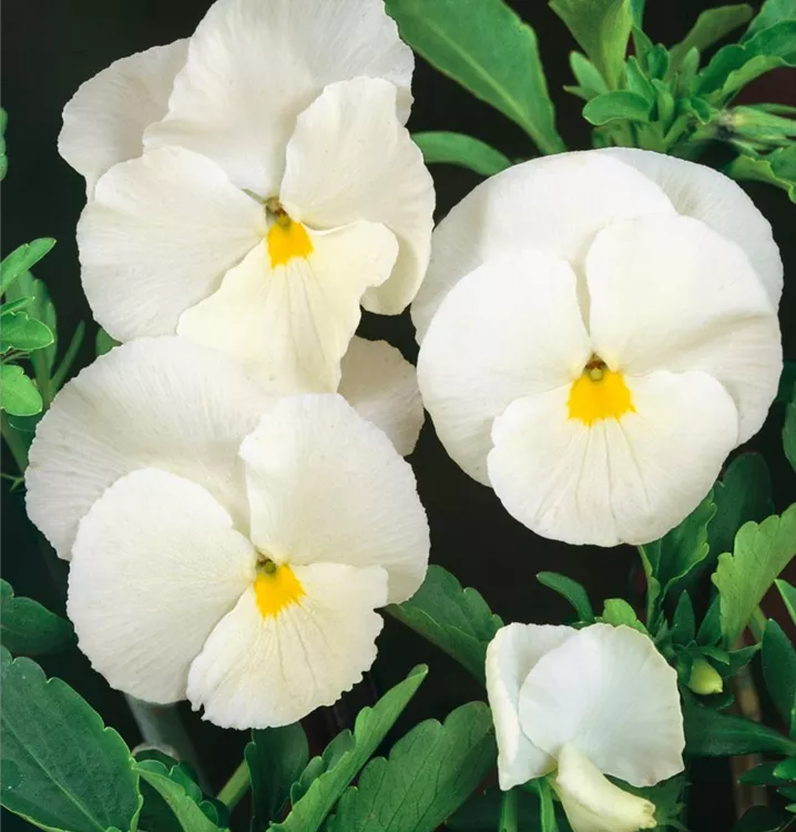 Viola x wittrockiana, weiß bildet während der gesamten Saison zahlreiche weiße Blüten.