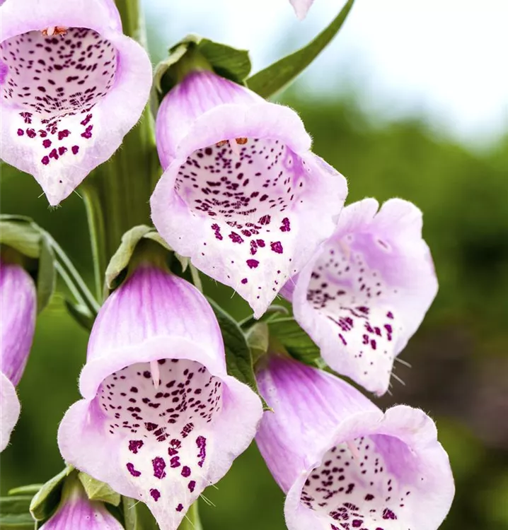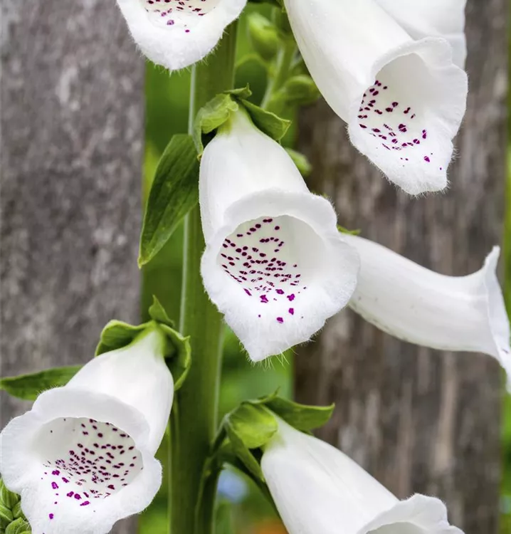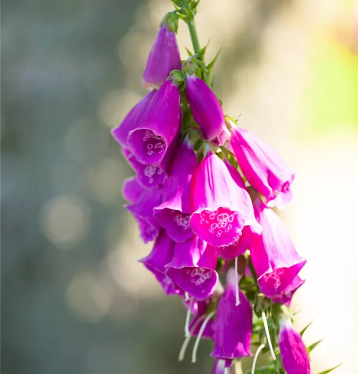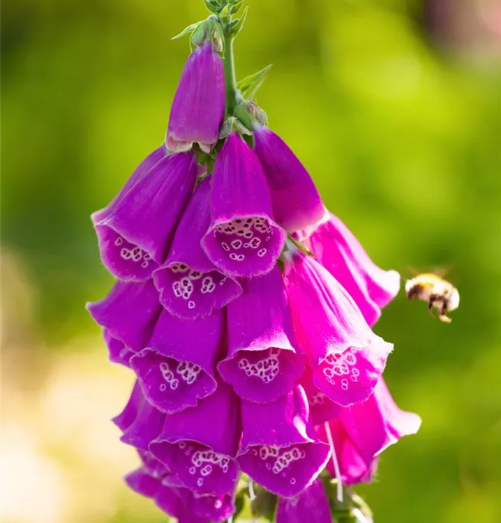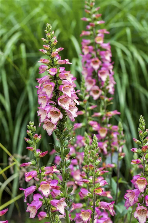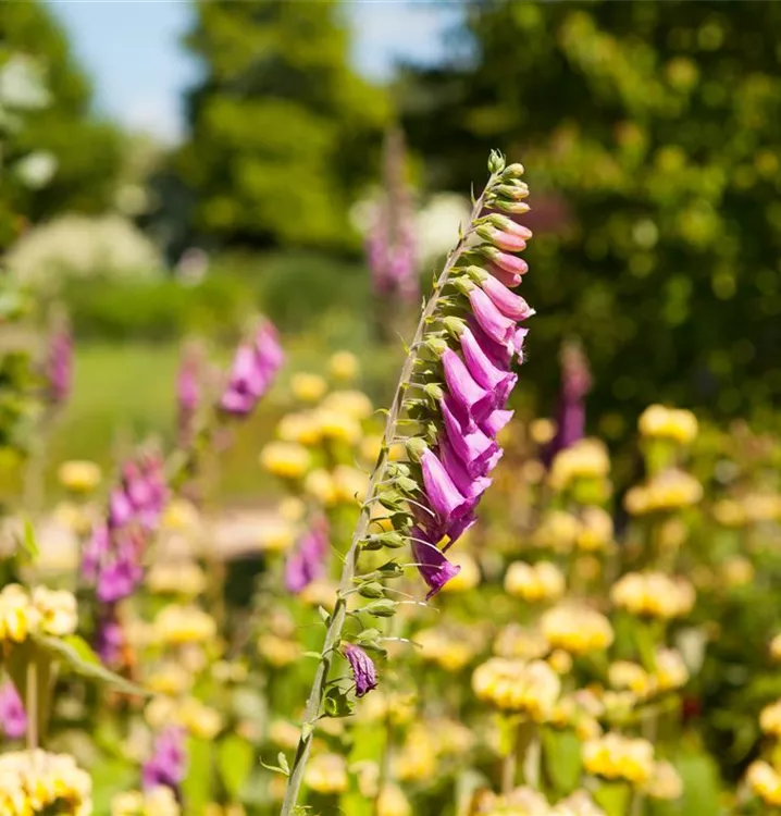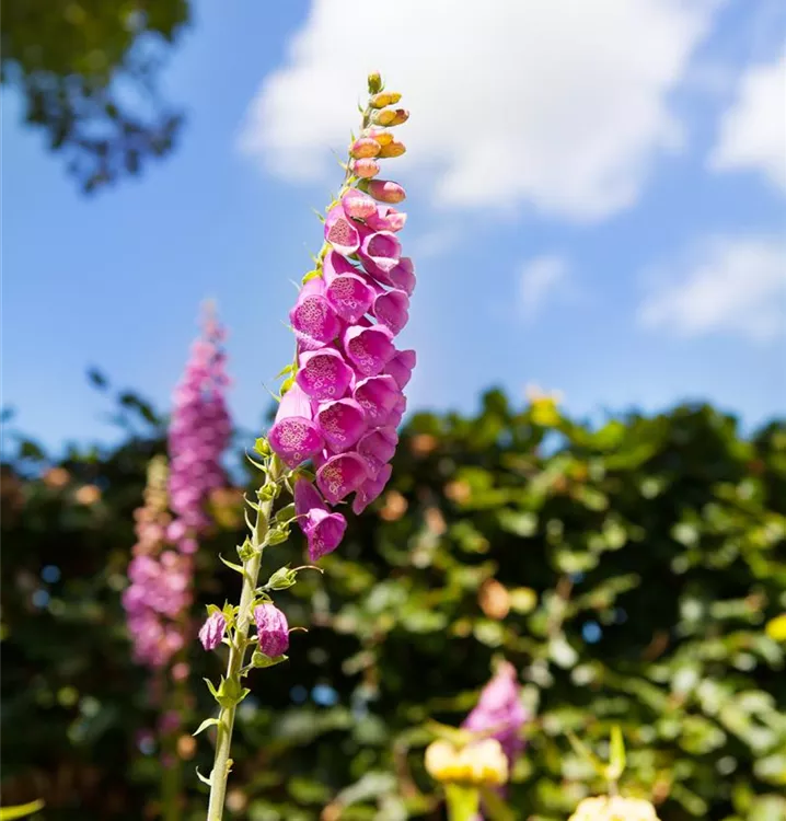 Der Garten-Fingerhut (Digitalis purpurea) ist eine aufrechte wintergrüne Staude, die, je nach Sorte, trichterförmige Blüten in verschiedenen Farben bildet. An einem sonnigen bis halbschattigen Standort mit durchlässigem, kalkfreiem Boden erreicht er gewöhnlich eine Höhe von ca. 1,3 m und wird ca. 40 cm breit. Der Garten-Fingerhut ist gut frostverträglich.