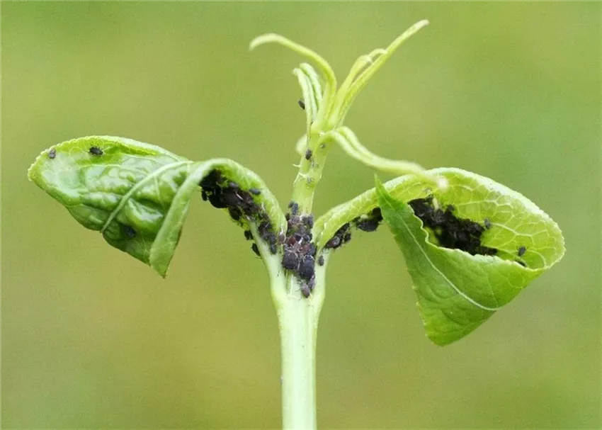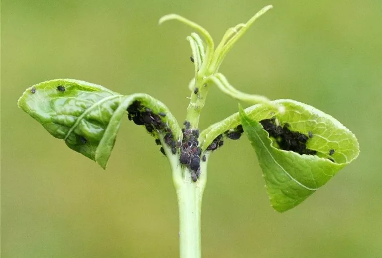 Im Frühjahr sitzen schwarze Blattläuse in großer Zahl an jungen Trieben und Blättern. Durch die Saugtätigkeit können Blätter und Triebe verkrüppeln. Die zuckerhaltigen Ausscheidungen der Tiere verkleben die Blätter. Auf diesem Honigtau siedeln sich sehr bald schwarze Rußtaupilze an.