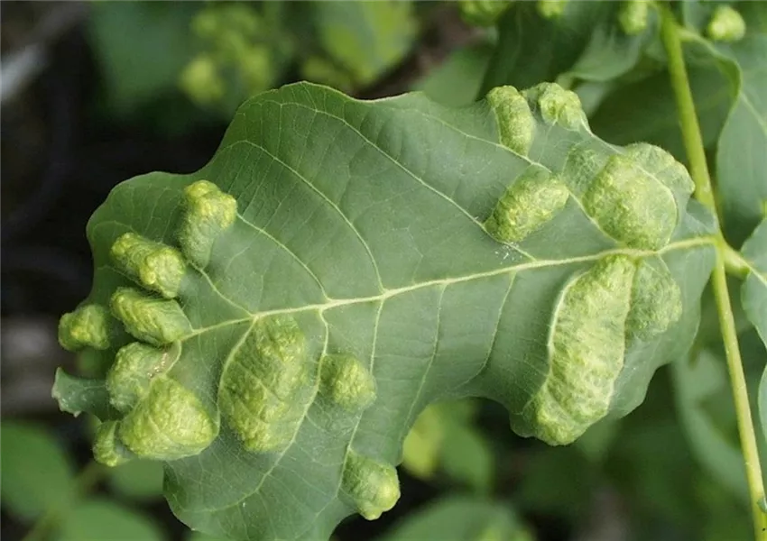 Auf den Blättern bilden sich blasige Aufwölbungen, deren Unterseite von einem weißlichen Haarfilz bedeckt ist, der sich später braun färbt.