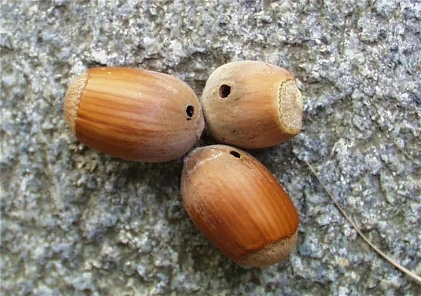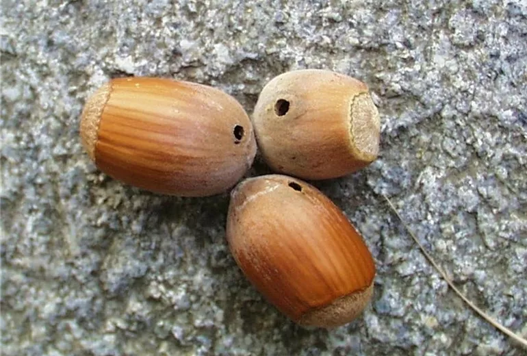 Die Nüsse weisen ein rundes Bohrloch auf. Der Kern ist heraus gefressen und das Innere der Nuss ist mit schwarzkrümeligem Kot verschmutzt.