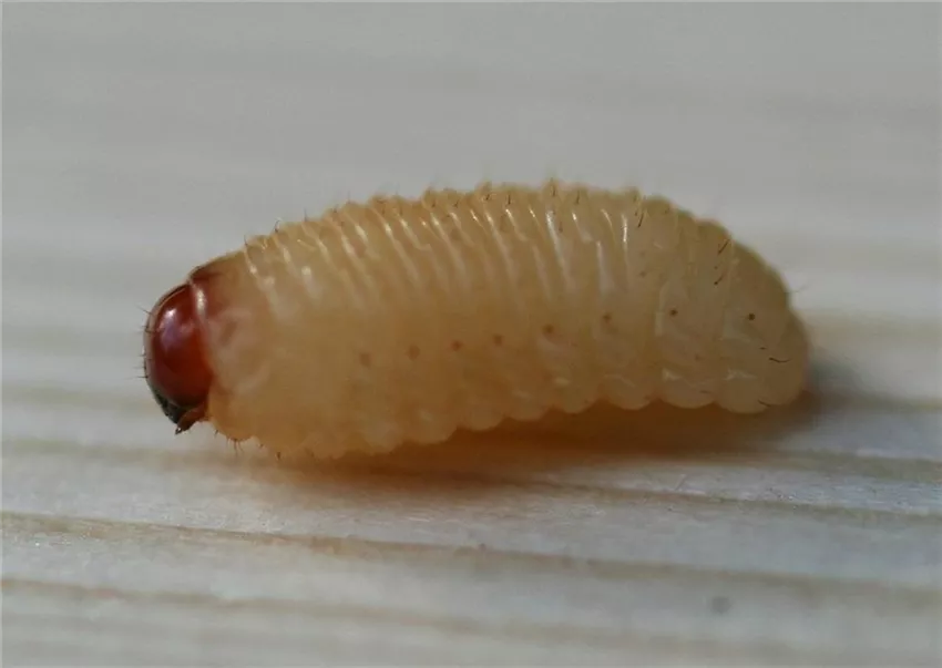 Manchmal findet man in der Nuss noch die gelblichweiße Larve des Haselnussbohrers, die einen rotbraunen Kopf hat.