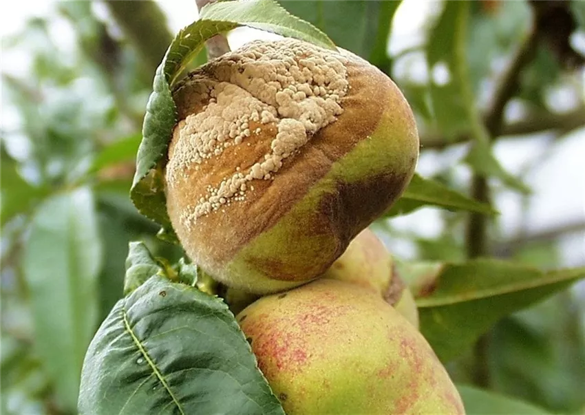 Die Sporen des Monilia Pilzes (Monilia laxa, Monilia fructigena) dringen über Wunden in den Pfirsich ein und zerstören sehr schnell das Fruchtfleisch, welches sich braun verfärbt. Die Schimmelpolster bestehen aus Unmengen von Sporen, die die Krankheit verbreiten.