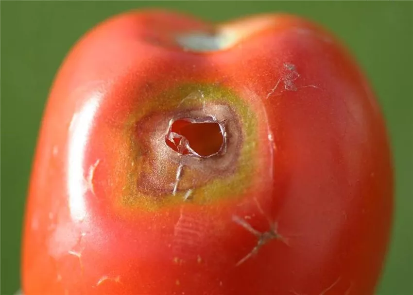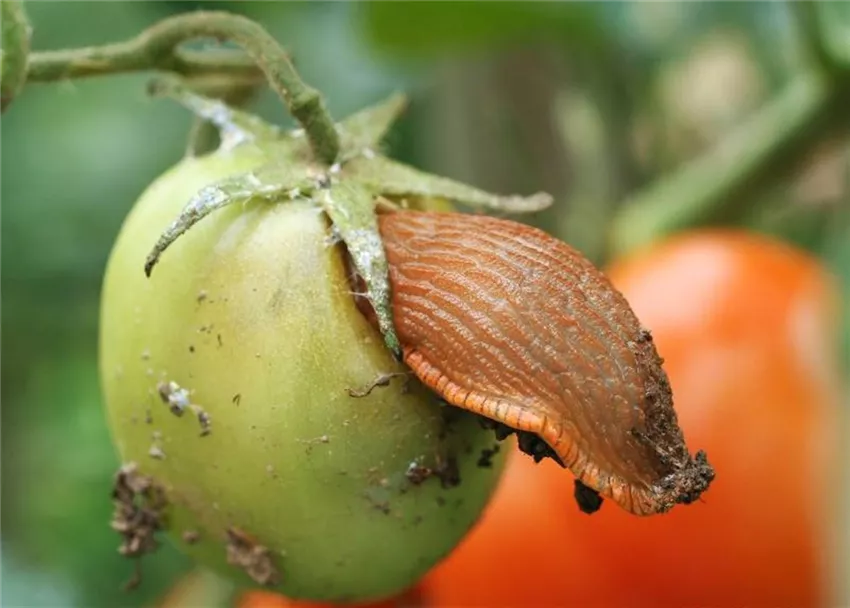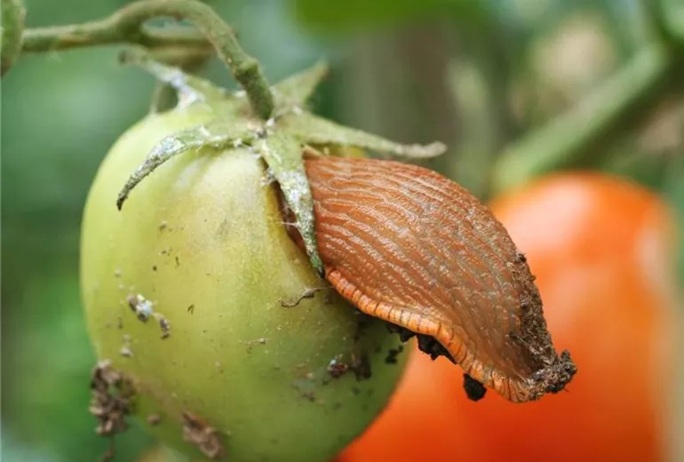 Die Blätter und Früchte der Tomaten zeigen Fraßspuren. Häufig sind auch die silbrigen Schleimspuren zu finden.
