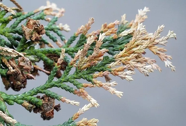 Neben Lebensbäumen zeigen auch Scheinzypressen (Chamaecyparis) und Wacholderarten (Juniperus) diese Absterbesymptome an den Trieben.