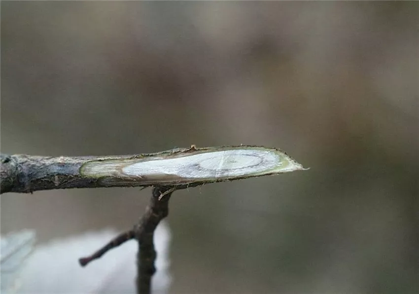 Schneidet man welkende Triebe schräg an, so sind die typisch graubraunen Verfärbungen im Bereich der Leitungsbahnen zu erkennen.