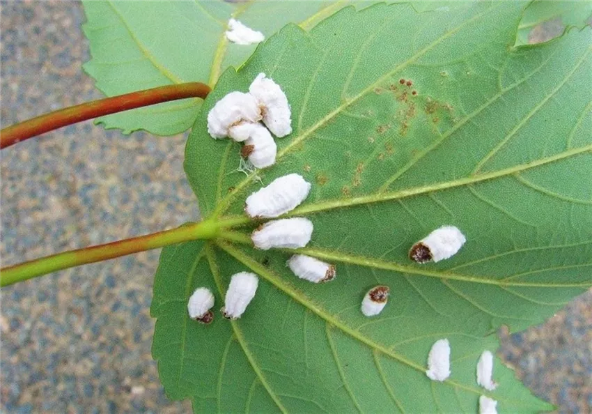 Bevorzugt auf der Blattunterseite der immergrünen Blätter sitzen längliche wollig weiße Eisäcke und evtl. auch die braunen Schilde der Schildläuse. Bei stärkerem Befall kann es zu massiver Honigtaubildung kommen.