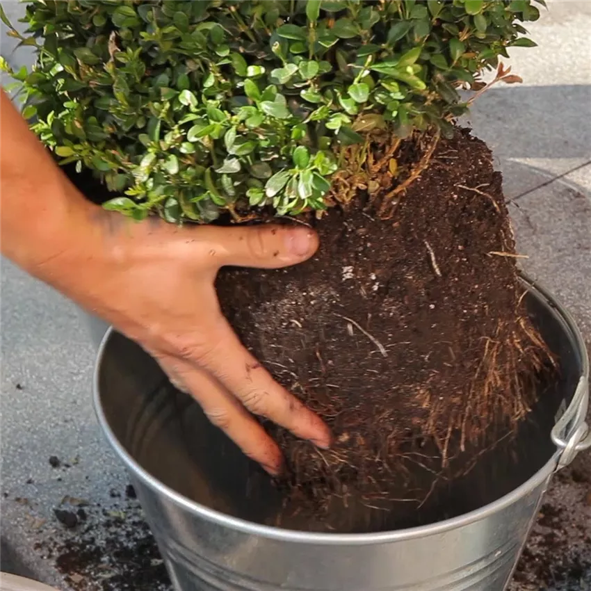Nehmen Sie den Buchsbaum aus dem Gefäß und entfernen verwelke Blätter und überschüssige Erde. Anschließend sollte das Wurzelwerk noch etwas aufgelockert werden.