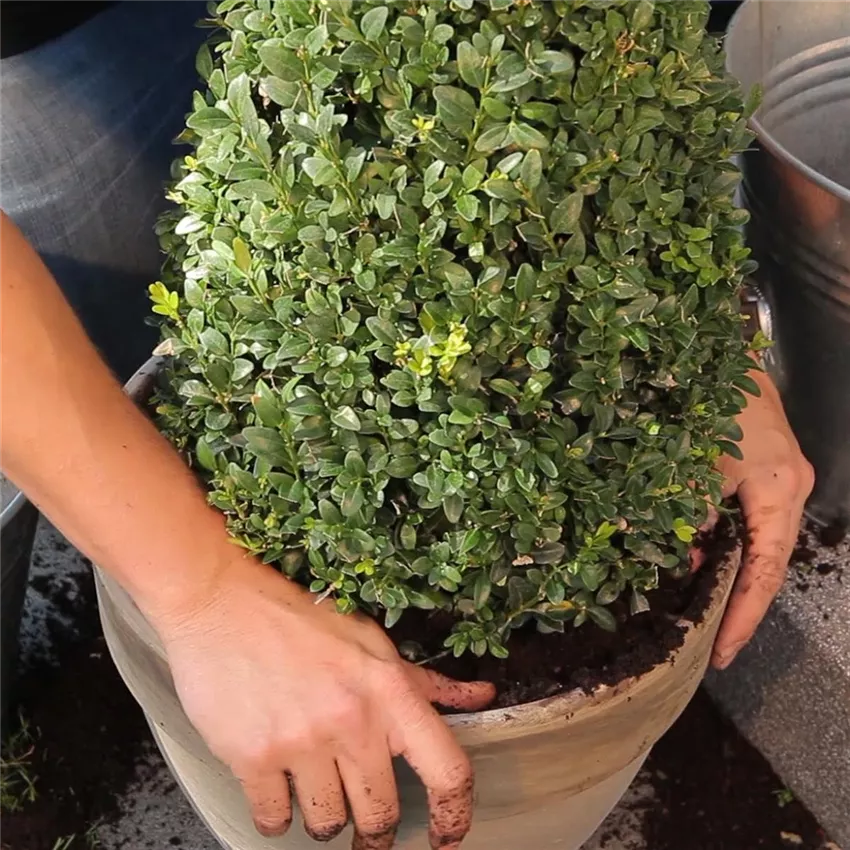 Gießen Sie die Pflanze zum Schluss gut an. Buchsbaum ist immergrün, das heißt auch in der kalten Jahreszeit ist sein Stoffwechsel aktiv. Die größte Gefahr im Winter ist übrigens das Austrocknen im Topf!