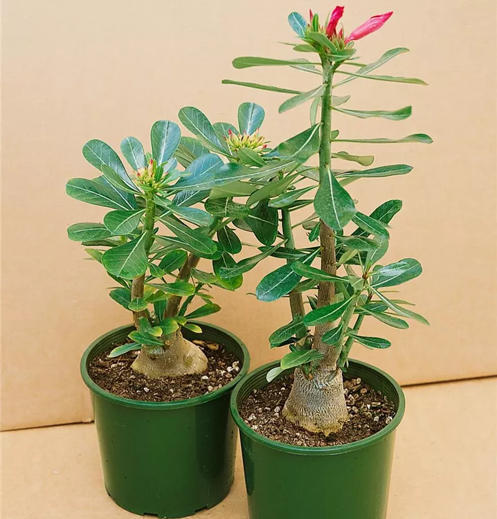 Die Wüstenrose (Adenium obesum) ist eine Pflanze mit mittelgrünen, lanzettlichen, ganzrandigen Blättern. Die röhrenförmigen Blüten erscheinen im April. Diese strauchartige und sukkulente Pflanze gedeiht am besten an einem sonnigen Standort.