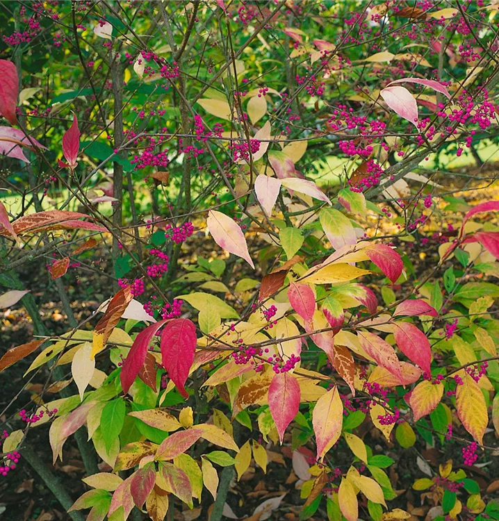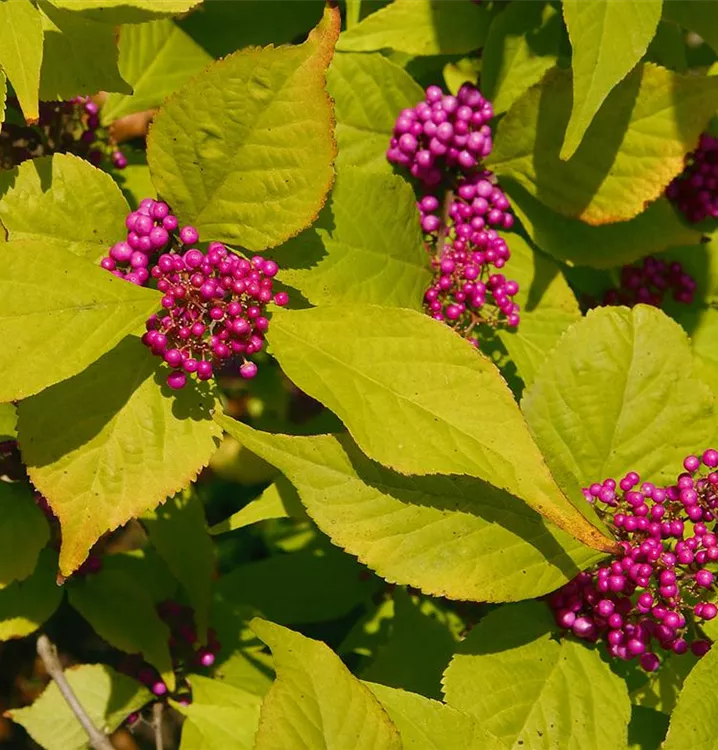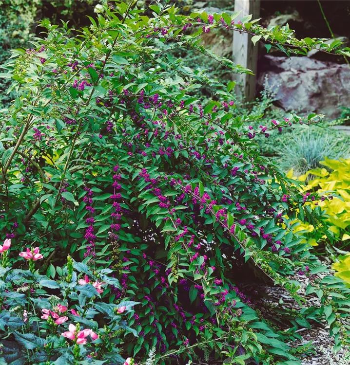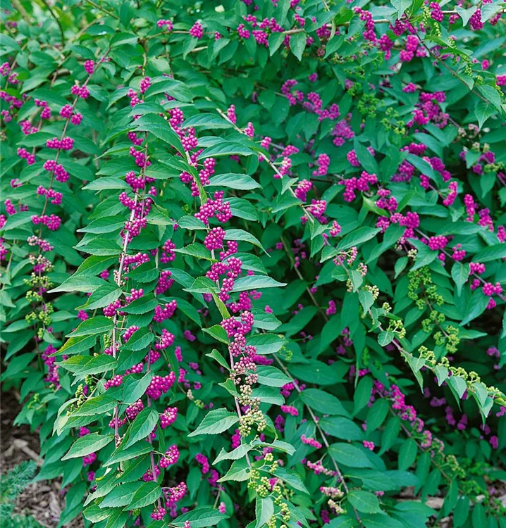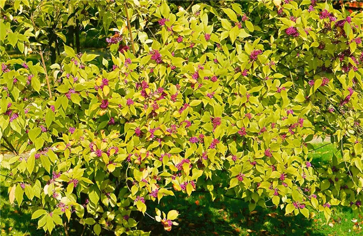 Die Purpur-Schönfrucht (Callicarpa dichotoma) eine kompakte Gartenpflanze, die, je nach Sorte, Blüten in verschiedenen Farben hervorbringt. An einem sonnigen bis halbschattigen Standort mit durchlässigem, humosem, sandigem, lehmigem Boden erreicht sie gewöhnlich eine Höhe von ca. 1,5 m und wird ca. 1,2 m breit.
