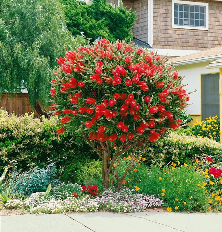 Callistemon citrinus, Stamm bildet während der gesamten Saison zahlreiche rote Blüten. Bei richtiger Pflege Nachblüte im Februar.