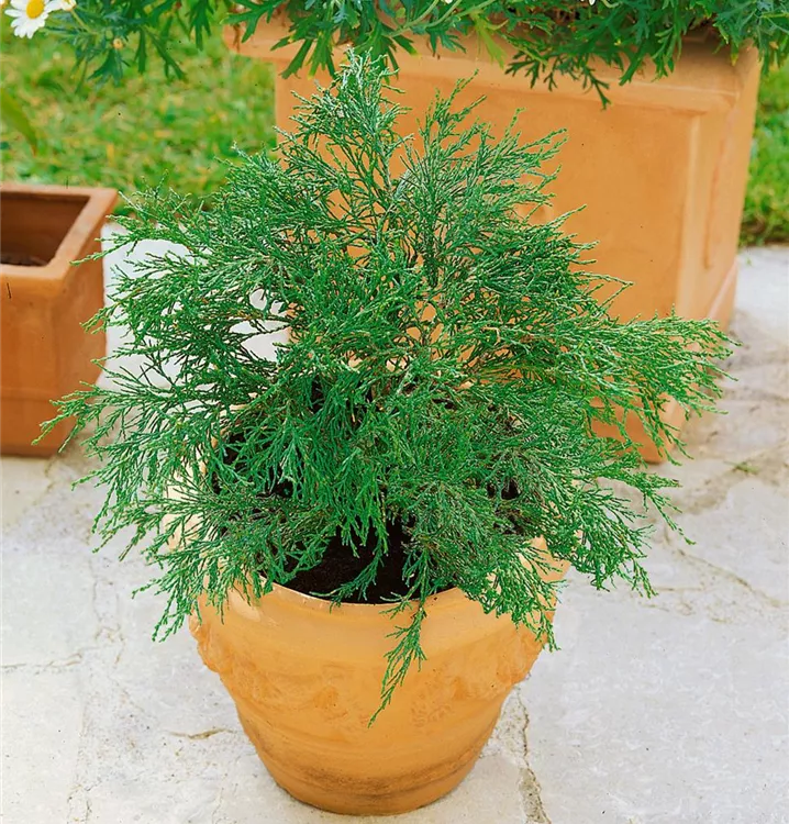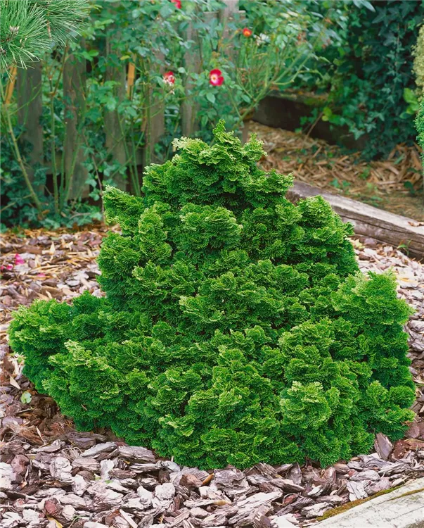 Die Muschelzypresse (Chamaecyparis obtusa) ist ein Gehölz, welches rundlich wächst und gewöhnlich eine Höhe von ca. 2 m und eine Breite von ca. 2 m erreicht. Dieses Gehölz ist gut frostverträglich. Sie bevorzugt durchlässigen, humosen Boden in sonniger bis halbschattiger Lage.