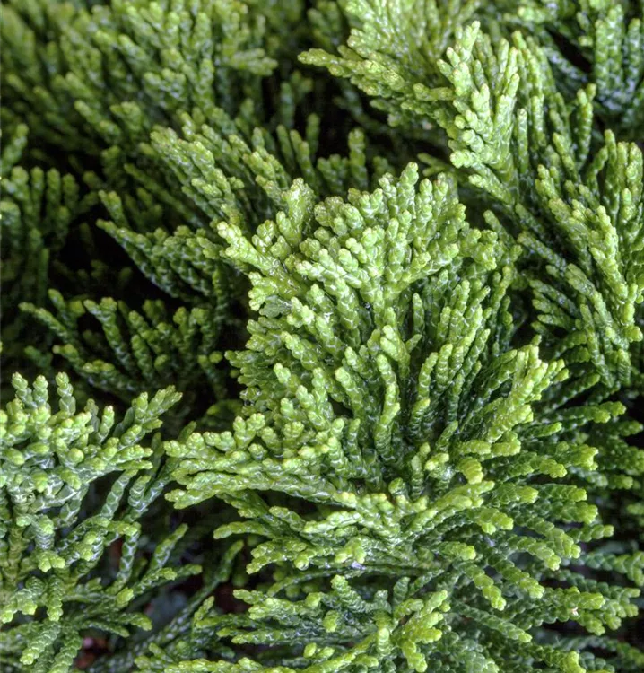 Die Kleine Muschelzypresse 'Nana Gracilis' ist immergrün. Ihre Nadeln sind dunkelgrün, glänzend, schuppenförmig.