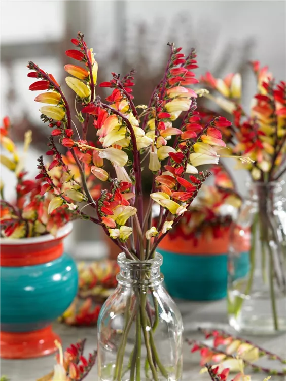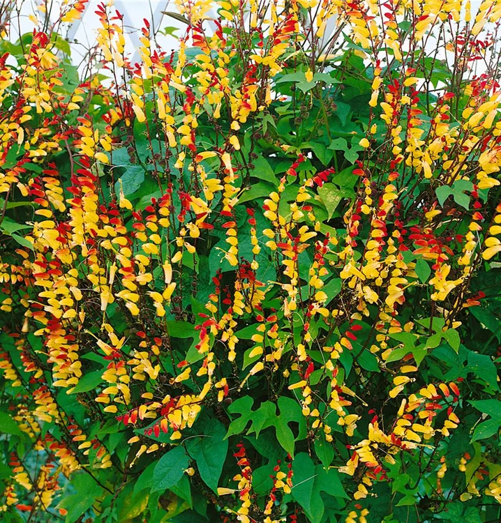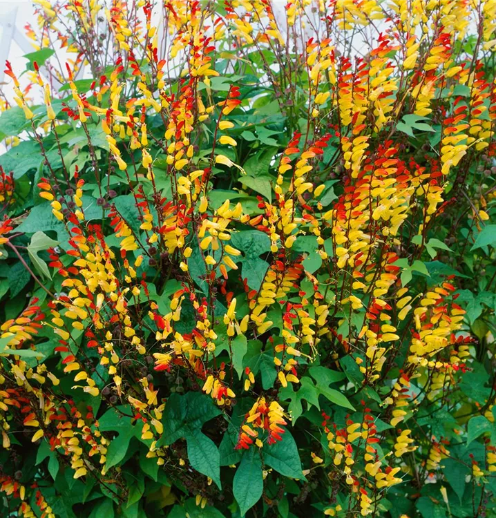 Die Gartenwinde (Ipomoea lobata) eine kletternde, rankende Gartenpflanze, die, je nach Sorte, becherförmige Blüten in verschiedenen Farben hervorbringt. An einem sonnigen Standort mit durchlässigem, nährstoffreichem Boden erreicht sie gewöhnlich eine Höhe von ca. 4 m und wird ca. 1 m breit.