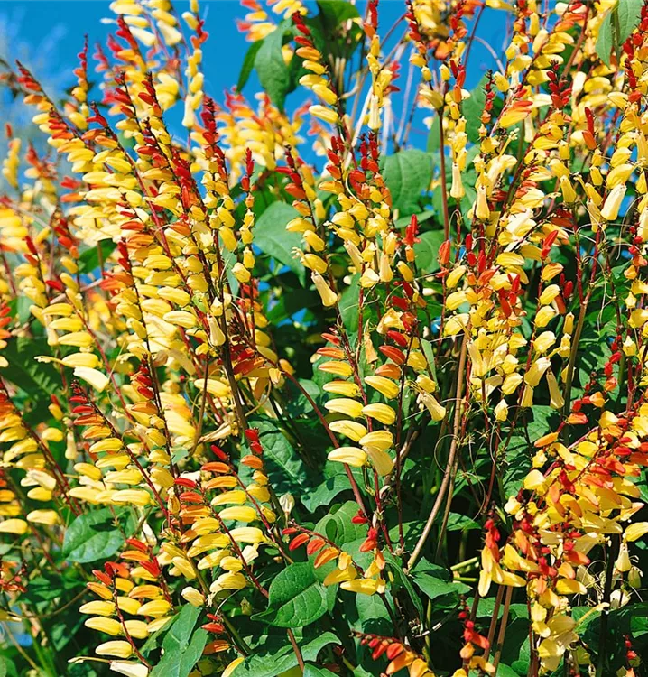 Die gelb-roten, becherförmigen Blüten der Gartenwinde erscheinen in Wickel von September bis November.