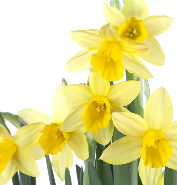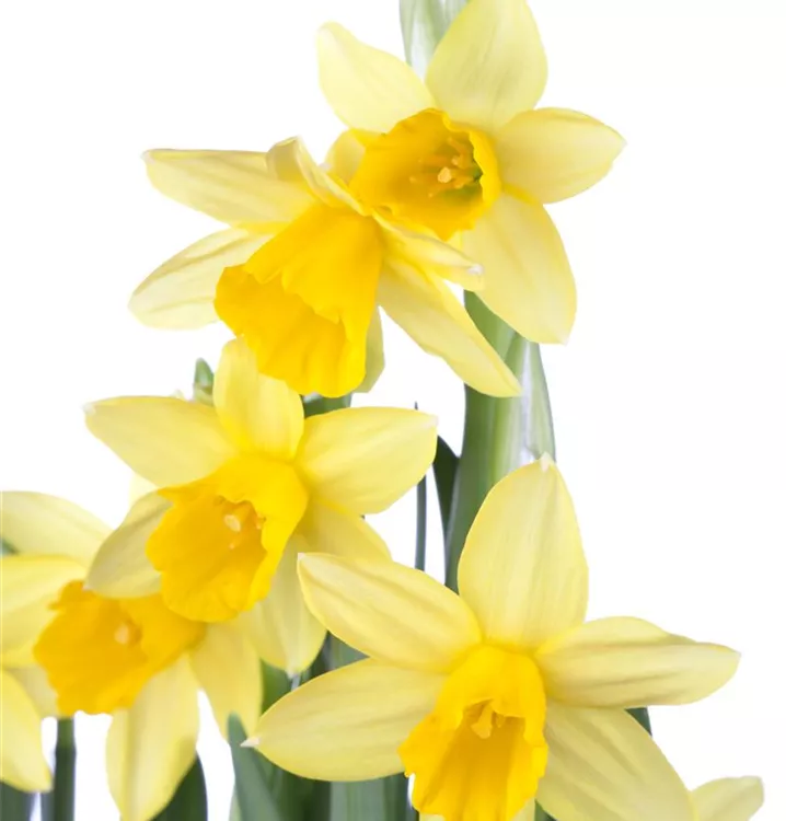 Die gelben, radförmigen oder röhrenförmigen Blüten der Alpenveilchenartigen Garten-Narzisse 'Tête à Tête' erscheinen in Trauben von März bis April. Diese sind angenehm duftend.