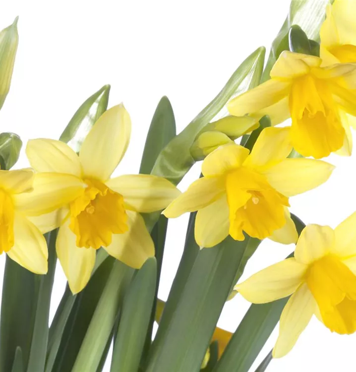 Die Blätter der Alpenveilchenartige Garten-Narzisse 'Tête à Tête' sind dunkelgrün, lineal.