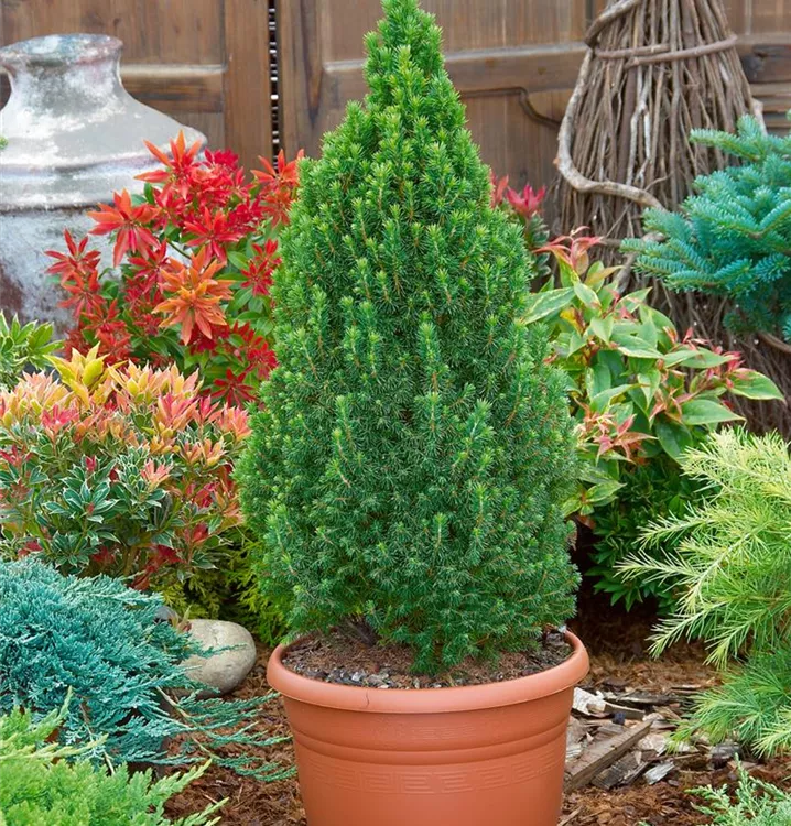 Die Weiß-Fichte (Picea glauca) ist ein Baum, welcher aufrecht wächst und gewöhnlich eine Höhe von ca. 5 m und eine Breite von ca. 2,5 m erreicht. Ihre nadelförmigen Blätter haben eine blau-grüne Färbung. Dieses Gehölz ist gut frostverträglich. Sie bevorzugt durchlässigen Boden in sonniger bis halbschattiger Lage.
