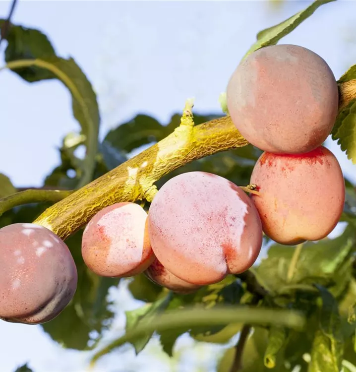 Die Pflaume (Prunus domestica) bildet purpurviolette Früchte. Sie haben einen süß-säuerlichen Geschmack. Für eine ertragreiche Ernte ab August schaffen durchlässiger, humoser Boden und ein sonniger bis halbschattiger Standort optimale Bedingungen. Auch ihre weißen Blüten sind eine schöne Erscheinung.