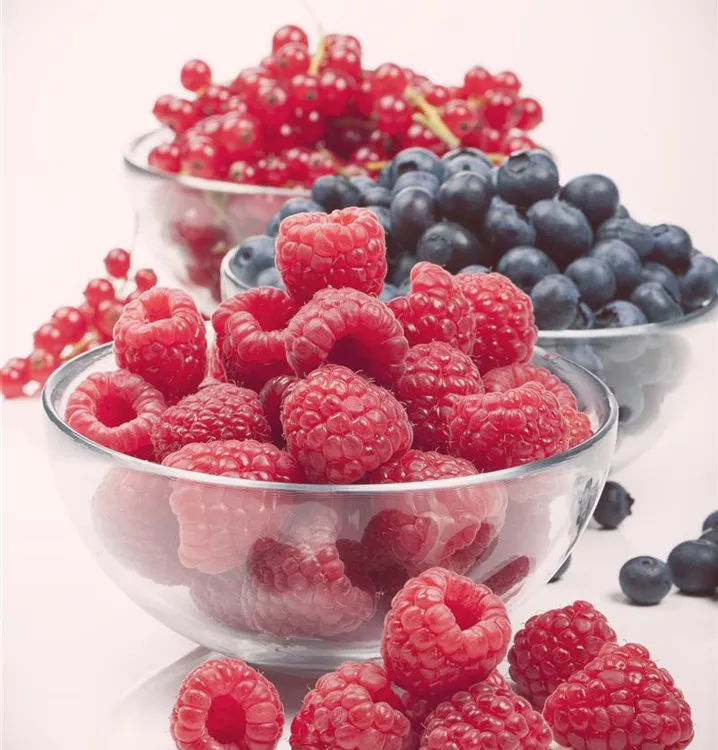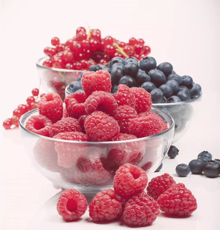 Die roten Beeren haben einen süß-säuerlichen Geschmack. Reifezeit ab Juni.